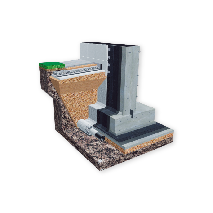 Система применяется для гидроизоляции фундаментов зданий и сооружений с эксплуатируемыми подвальными помещениями в песчаных грунтах с высоким уровнем грунтовых вод или в глинистых грунтах независимо от уровня, который определяется в ходе исследований и проектирования.