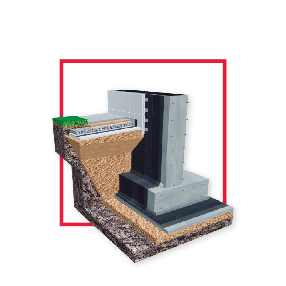Система МК-ФУНДАМЕНТ МАСТИКА используется для защиты фундаментов зданий и сооружений с техническим подвальным этажом, расположенных на песчаных грунтах с низким уровнем грунтовых вод. Уровень грунтовых вод определяется в ходе изысканий и проектирования.